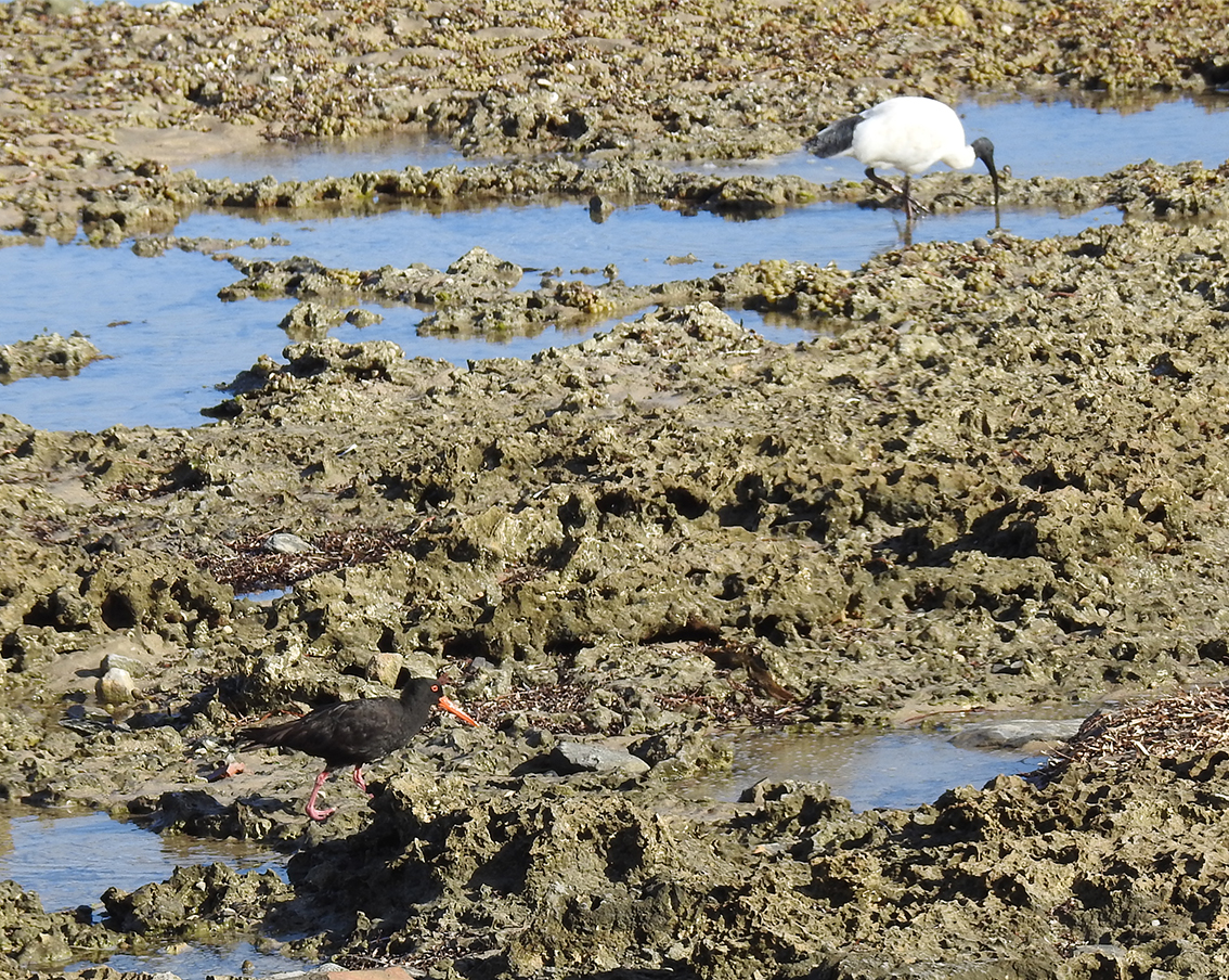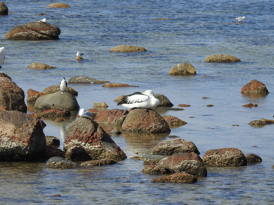 I am walking from the Bert Puxley Reserve near the boat ramp back along the foreshore towards Muwerang-Kent Reserve at the mouth of the Inman River. The tide is out and a variety of waterbirds are feeding in the shallow rock pools that characterise this stretch of water.