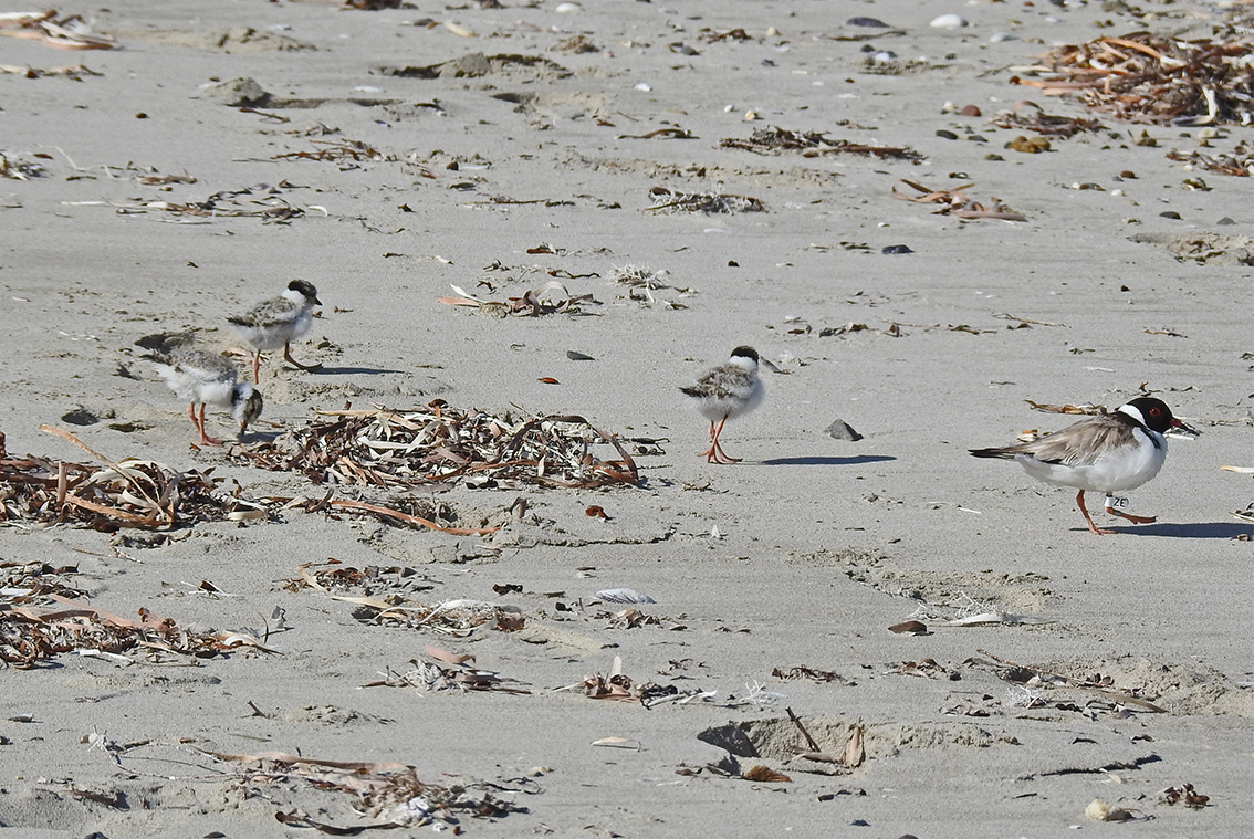 The small shore bird leads its chicks across the sand towards the water. They peck at the sand mimicking the parent as she forages for food. Rare and lovely birds, Hooded Plovers nest in a protected zone on the beach.