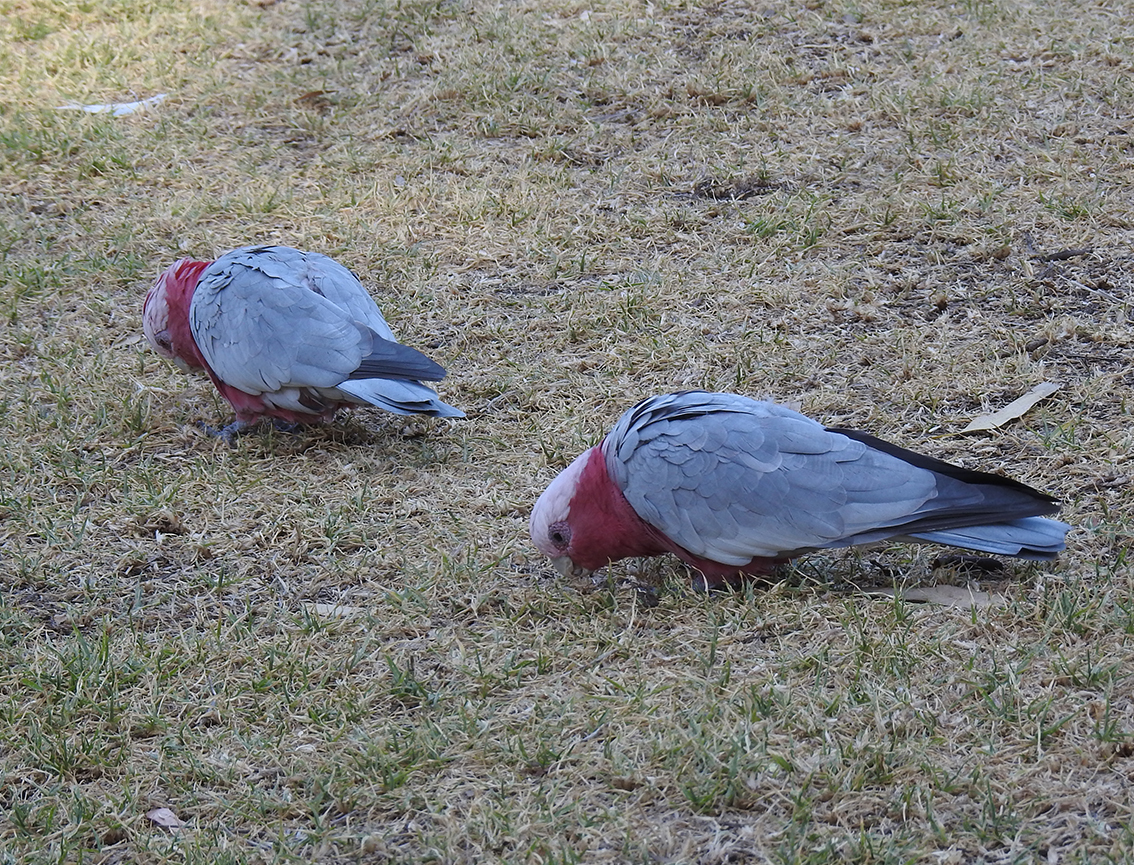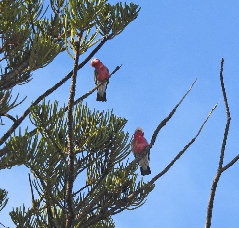 Tall Norfolk Island Pines line the pathway and a group of Rose-breasted Cockatoos (Galahs) are squawking and squabbling in the topmost branches while others feed on the grassy verge.