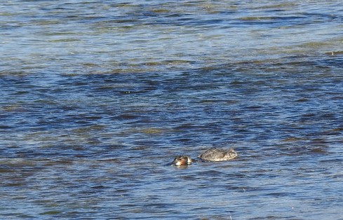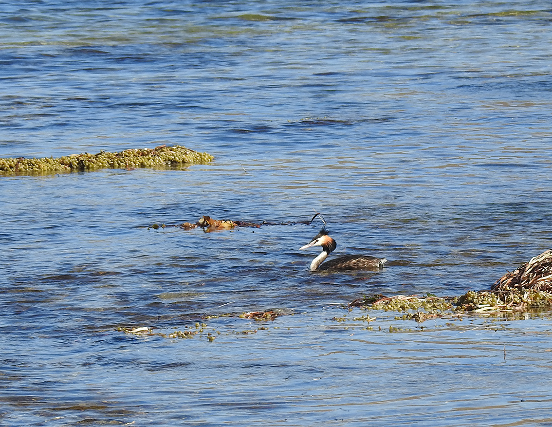 Much to my surprise, I catch sight of an unusual bird pushing its way through the shallows, beak forward and seaweed strewn across its ornately crowned head. A Great-crested Grebe. A bird I have rarely encountered. Using the full extension of the Nikon P900 telephoto, I take a series of shots to capture this feeding behaviour.