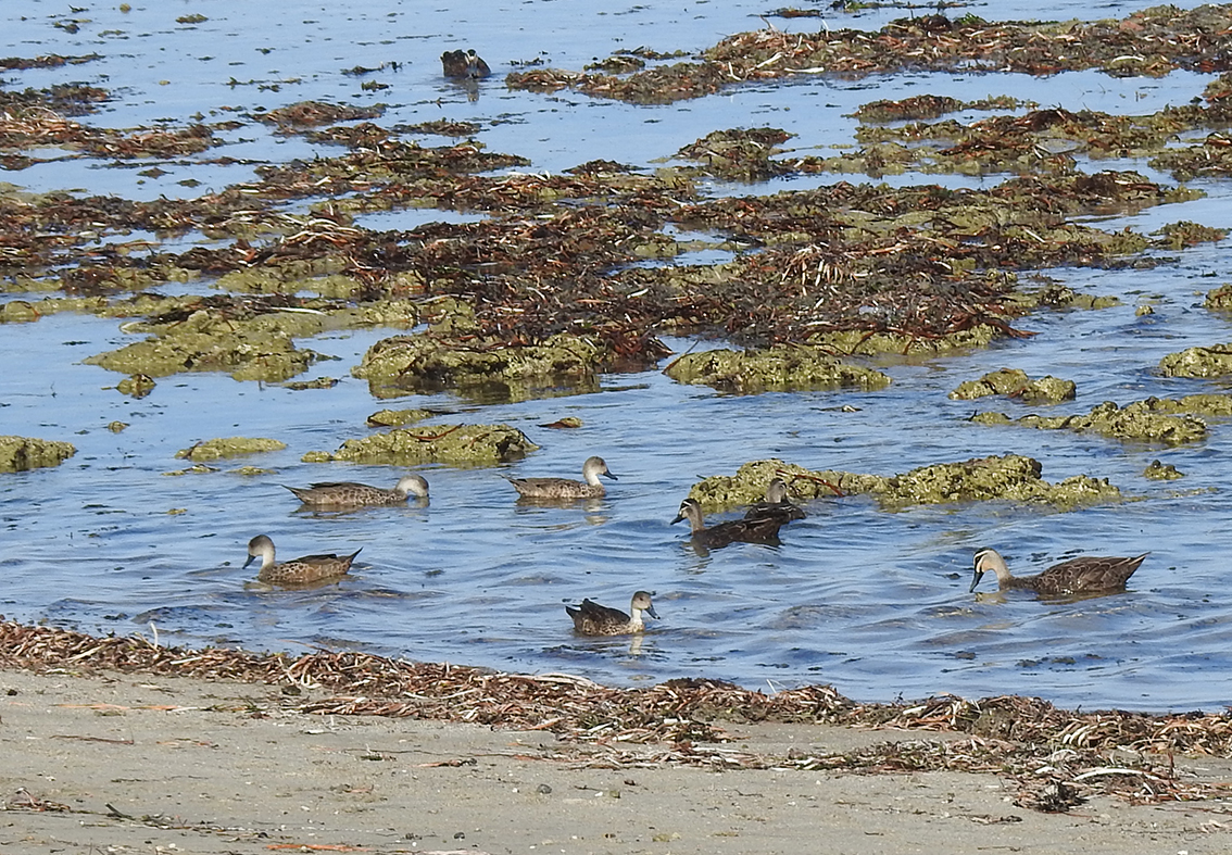 Leaving the path, I walk along the sandy beach scanning the water for other seabirds, dolphins, or fish caught in the shallow rock pools. I don’t have to walk very far before I spot a small group of waterfowl, Grey Teal and Pacific Black Ducks, in the shallows. They are birds I usually associate with fresh water.