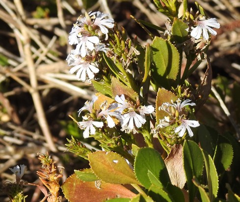 Although my walk has primarily focussed on the birdlife, the variety of coastal vegetation is notable. As well as the wiry grasses that hold sandy areas together there are numerous flowering bushes such as Cushion Fan-flower and Coastal Wattles and Myoporum.