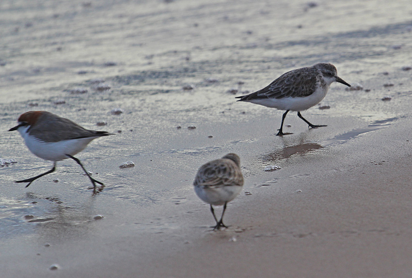 As I traversed the final set of dunes above the beach I felt the afternoon sea breeze on my face and caught the muffled crash of waves breaking on the shore. Several surfers were enjoying a choppy break and more adventurous anglers were wading into the white water to cast for salmon. I headed down to the sand to find one of the trail entrances to the dunes that open onto the beach. As I trudged through the soft sand I noticed a group of diminutive shore birds racing between the foamy lines of waves curving up the beach. At first glance they appeared to be similar in appearance but a more critical look through the telephoto revealed a mixture of species and sexes.