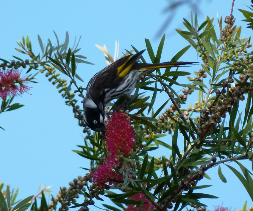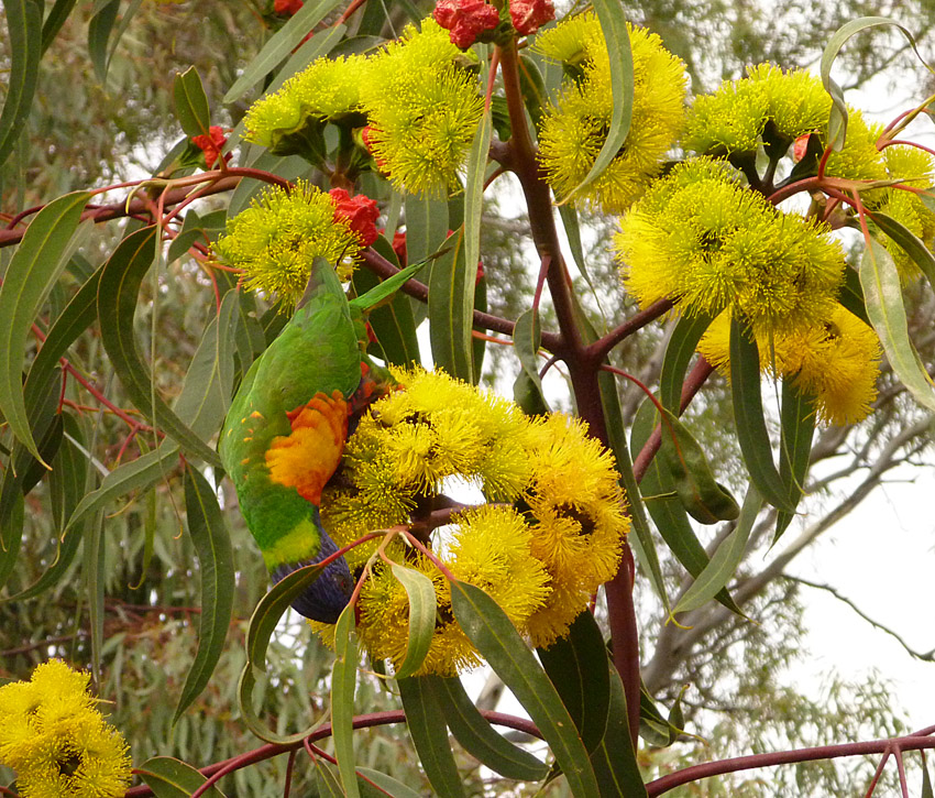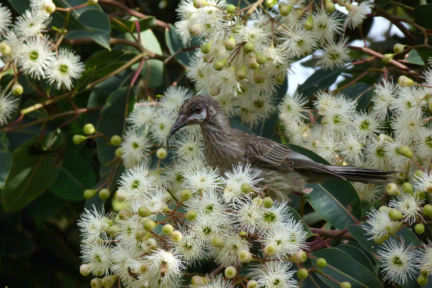 A couple of sizeable eucalypts dominate the back of the garden. The smaller of the two has large yellow flowers that blossom in the spring and tends to attract a wide variety of parrots, especially rainbow lorikeets. The larger tree has smaller, white flowers that seem to be at their best around Christmas. The snowy blossoms are a favourite food for several different species of honeyeaters including the largest of all; the wattle bird whose raucous cry sound remarkably like wakeup…wakeup.