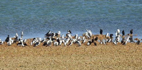 Driving around the island only takes a few minutes but there are several minor roads and tracks leading down to the sea that are well worth exploring. Along one small trail I have an uninterrupted view of the skeletal remains of an old fishing boat and a mixed accumulation of pied and black cormorants on a small exposed beach.