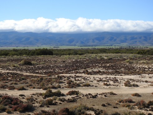 As I reach the island I notice a small park with children’s play equipment, shelter and barbecues. Nearby there is a boat ramp and a walking trail that skirts the mangroves. A school of mullet are feeding in the shallows and I can hear the calls of mangrove warblers and herons in the tangles of trunks and leaves that crowd the water’s edge. The view from the park back across the mainland to the lower Flinders is spectacular with low clouds enveloping the crest of the hills.