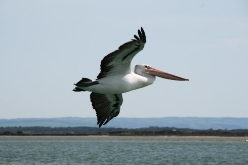 There is a magnificent pelican flying low over the estuary with thick scrub and hills in the background. It circles a few times then lands, with surprising grace for such a large bird, amongst a small group of pelicans. They comb the edge of the water hunting for schools of baitfish. The birds then circle their prey driving them into a small ball before scooping the hapless victims up in their flexible net-like bills.