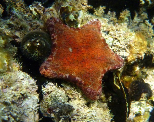 The reef has numerous invertebrates clinging to, and encrusting its wide variety of niches and a biscuit star is my first sighting. This pentagonal little seastar can be found on reefs and rocky surfaces and has a number of colour variations between light orange to reddish. It has quite large overlapping plates on its surface and has an arm radius up to 7cms.