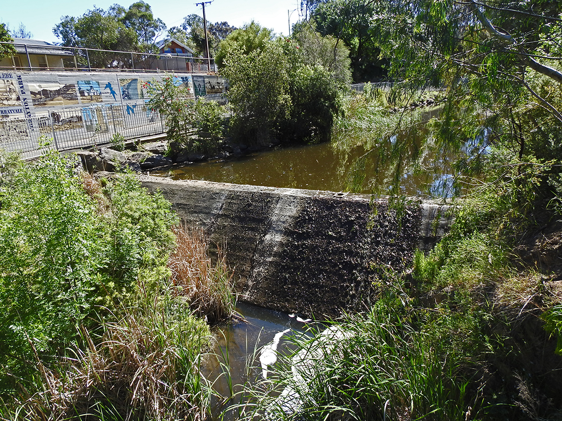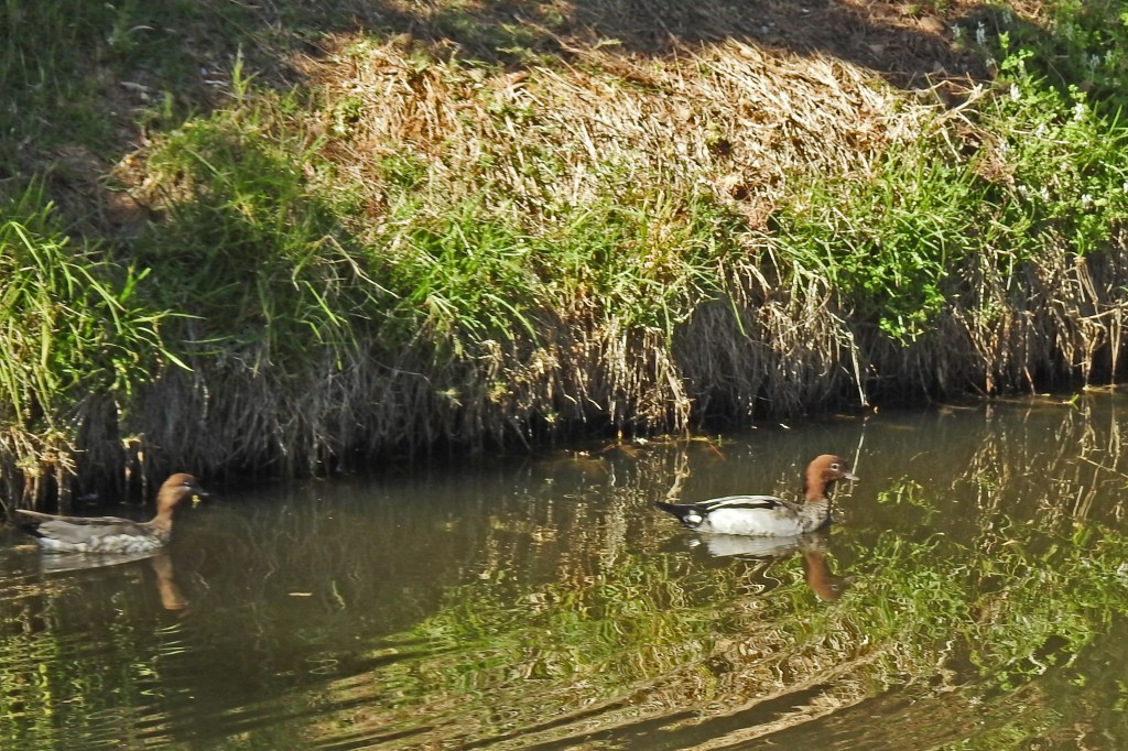 A bridge crosses the Victoria Creek at the T junction where the road from Adelaide intersects the B31/B34. From the bridge, I can see a small lake created by a weir. There are Eurasian Coots and a pair of Maned Ducks paddling near the bank.