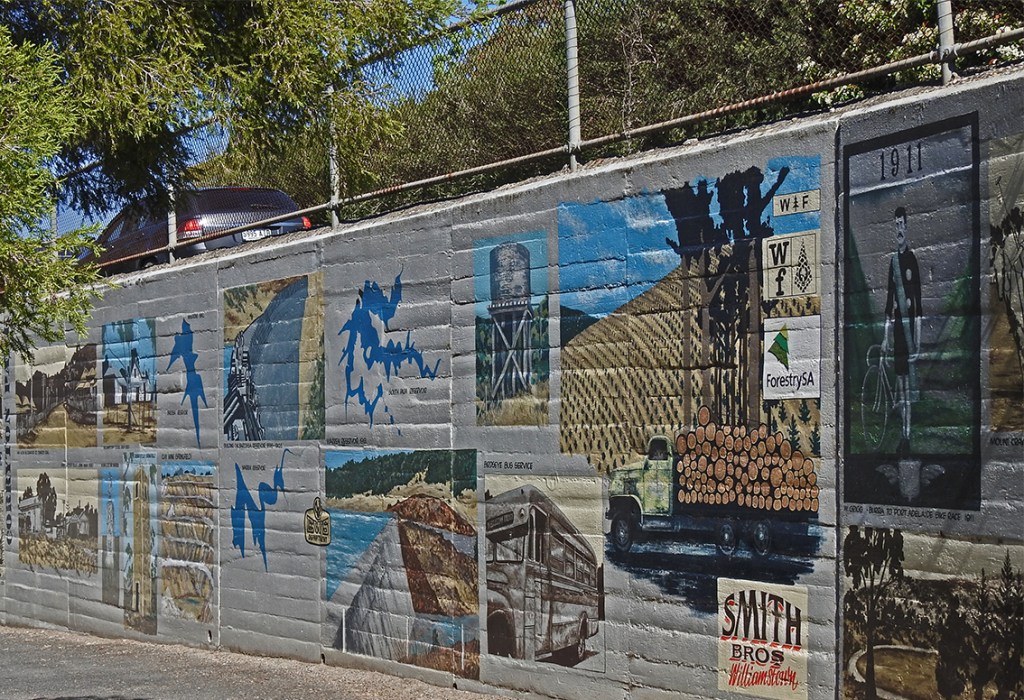 The wall alongside the path by the lake is decorated with a mural depicting Williamstown’s unique features such as: buildings, landscape and historical events.