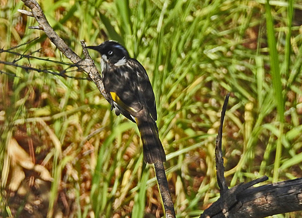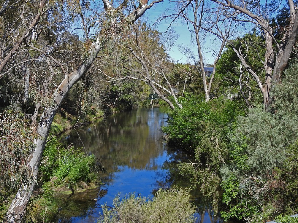 New Holland Honeyeaters and Silvereyes are feeding in the foliage of several large gums adjacent to the river.