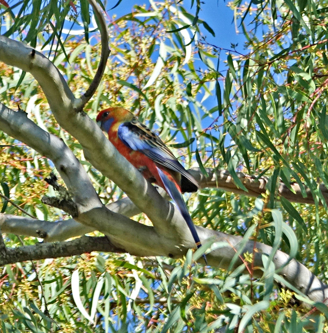 In a patch of scrub by one of these channels I notice a small group of Crimson Rosellas feeding on some grasses and a Whistling Kite high above in the branches.