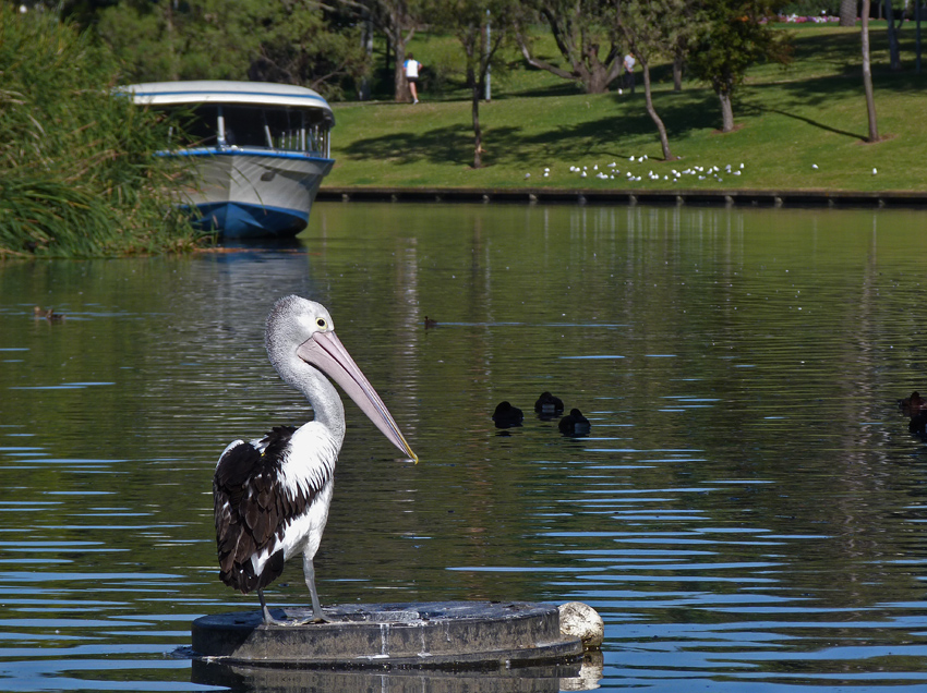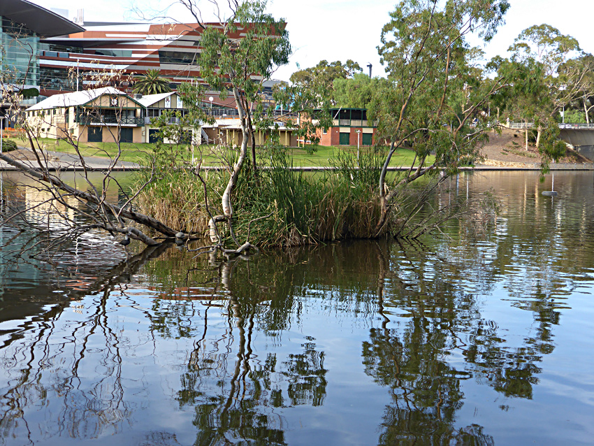 I am in Bonython Park by the Torrens River; downstream from the weir and opposite the Coca Cola factory on Port Road. Below me cycle and walking trails surround the waterway and a small causeway and larger train bridge cut across the river. The park abuts the holding paddocks for the police greys by the old jail and includes wide expanses of green space, a shallow paddling lake, kiosk and children’s playgrounds.
