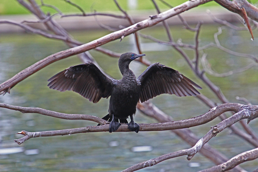 Downstream from the bridge there are several islets made from debris that has floated down the river during recent floods. Several pelicans have claimed this territory as a resting place and are squabbling over squatters’ rights. They duel with their beaks, neither giving way, while disturbing a group of black cormorants that are using the same area.