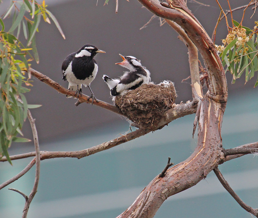 There are two rainbow lorikeets perched halfway up a red gum. They are exploring a potential nesting hole. First one bird pokes its head in then the other. Their house hunting is accompanied by much squawking, head bobbing and an occasional nip at each other. Just when they seem to have decided that this is the right site, a magpie lands on the branch just above them and both parrots take flight.