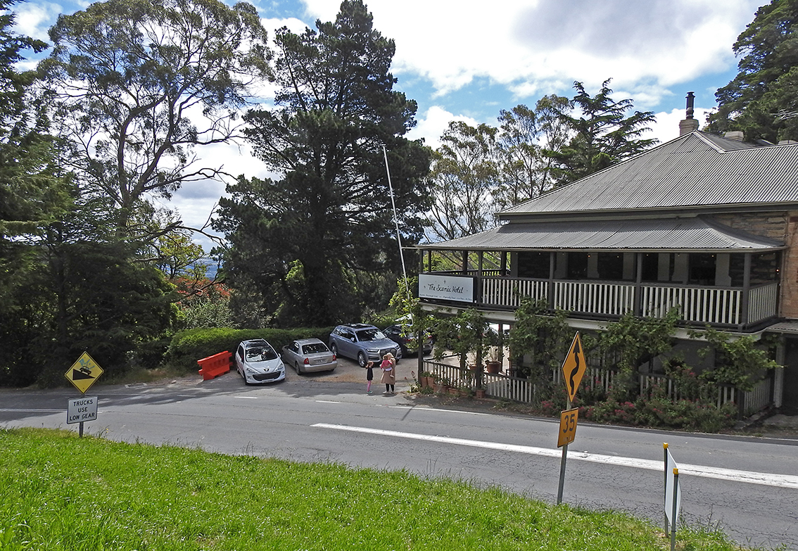 A Koala suddenly appears on the edge of the road then runs across both lanes. I check my mirrors and pull off into a small recess. Walking back along the edge of the road, I scan the trees until I spot the Koala high in the branches looking down on me.