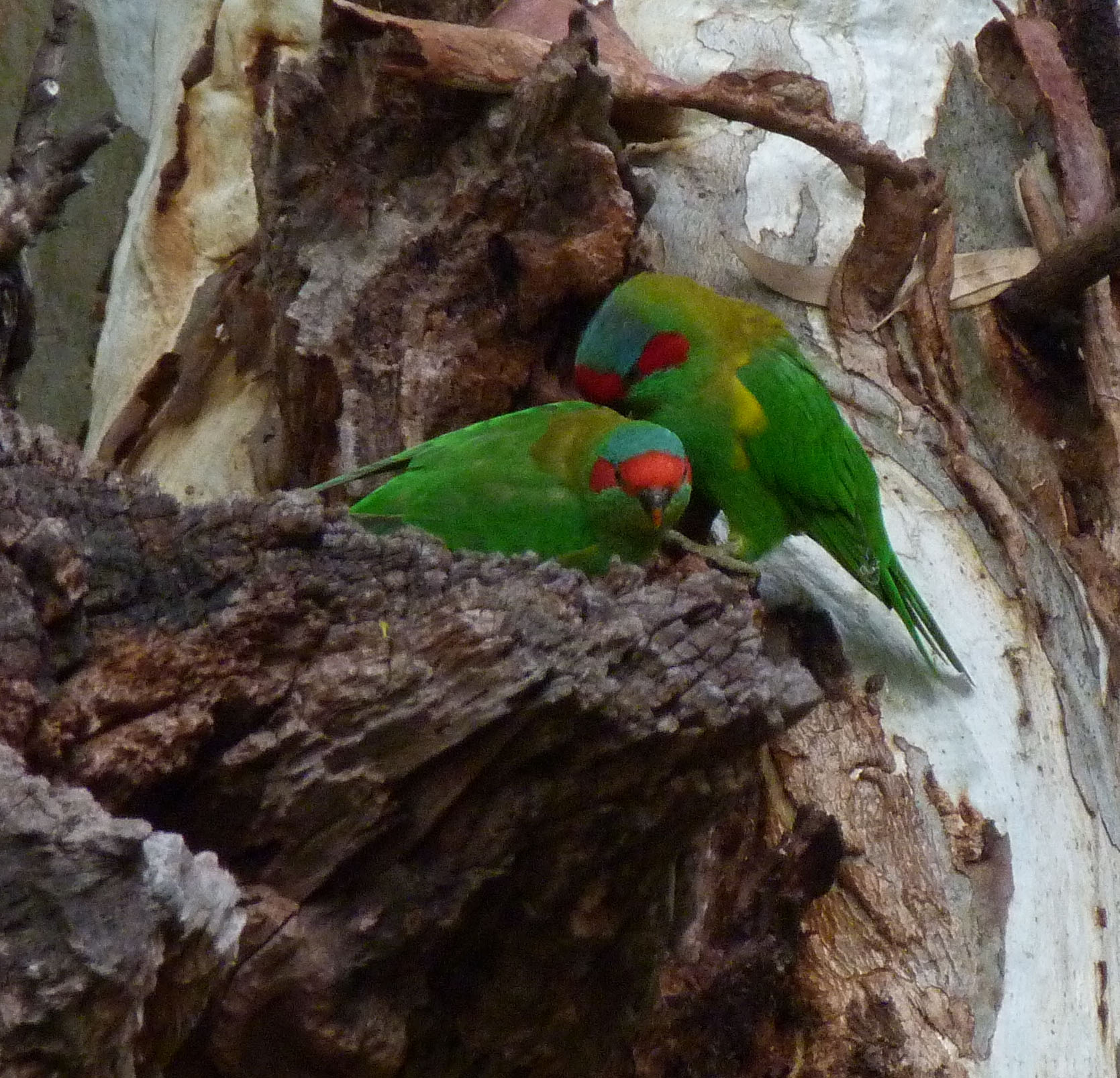 Musk Lorikeet pair bonding near nest hole