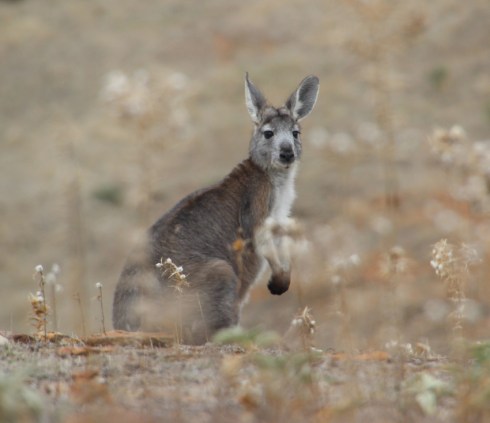 Our next encounter is on my side of the car. I notice a flash of grey in the undergrowth. Geoff sees it too and we slide to a halt. I am expecting to see a Western Grey Kangaroo and I am pleasantly surprised to spot a Wallaroo or Euro. These robust cousin of the more common Western Grey Kangaroo are more commonly found in the higher regions of the Flinders Ranges which form a backdrop to the coastal plain we are traversing.