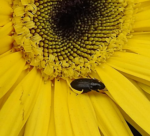 My first sighting is a tiny black beetle that is crawling across the petals of a bright yellow Gerbera. It resembles a lawn beetle, but in all honesty, there are so many beetle species, it is hard to identify.