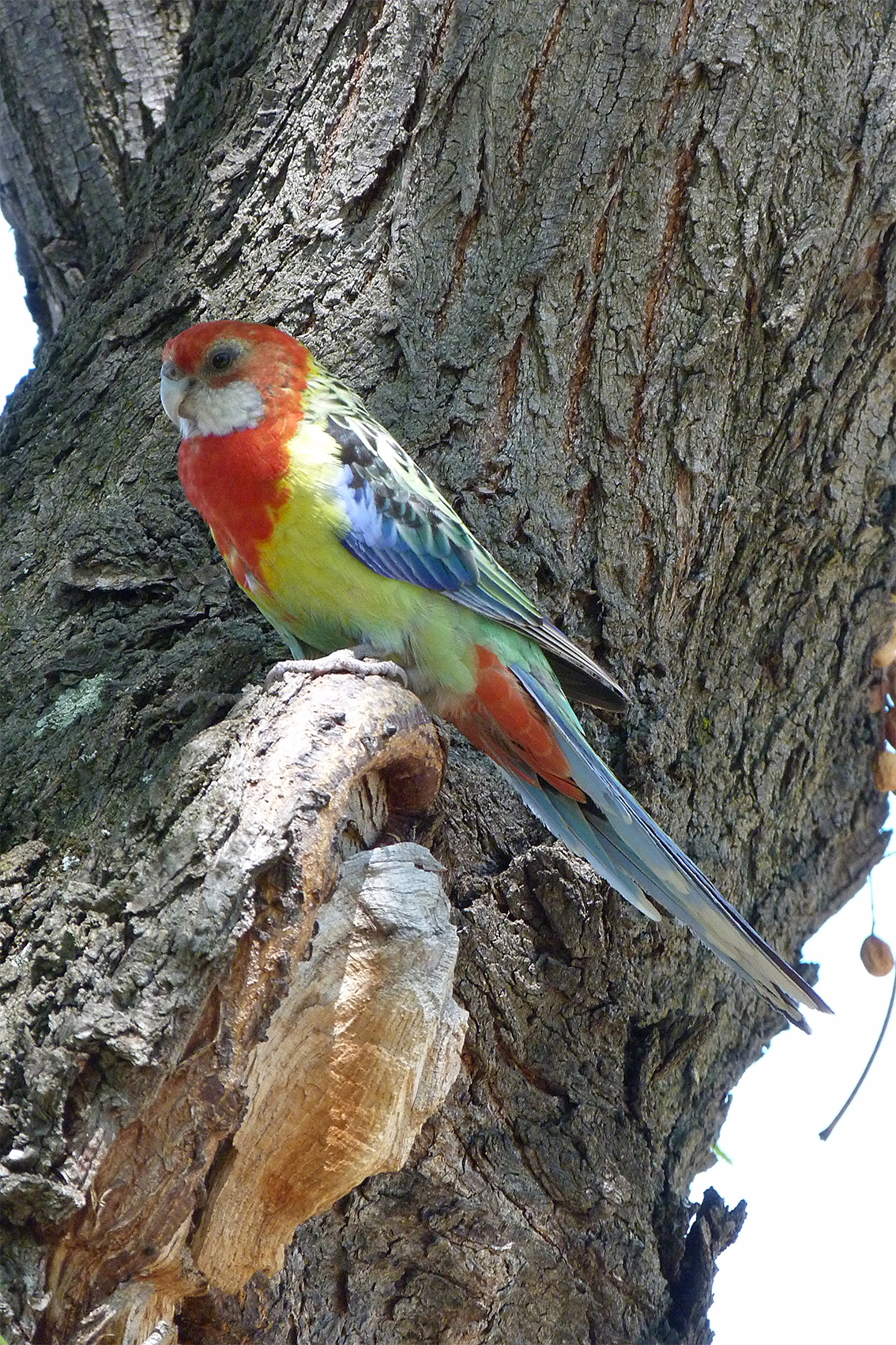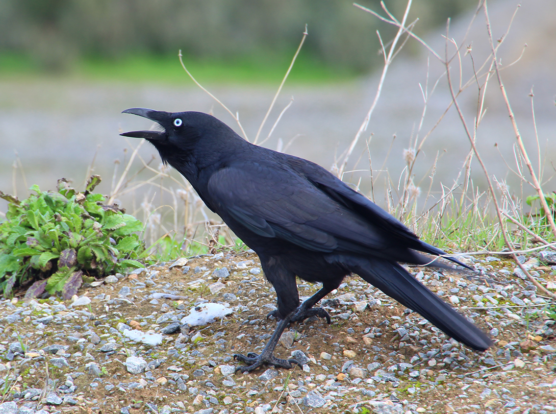 I finish my loop walk back at the car parking area where a pair of Adelaide Rosellas are feeding on the ground. They are some distance away and as I approach all but one fly into the canopy. The lone bird perches on a wiry grass stem where it appears to be picking out seeds. I take a shot from distance just before it flies off disturbed by a couple of Little Ravens flying into a nearby eucalypt.
