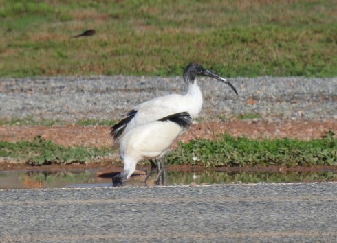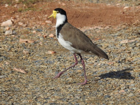 The receding tide has left the mud flats exposed and several species of birds are making use of the food sources it presents. A Sooty Oyster Catcher is probing the mud for shellfish and a Masked Lapwing is looking for worms and other soft bodied animals. Their beaks, feet and hunting styles are well adapted for each individual diet.
