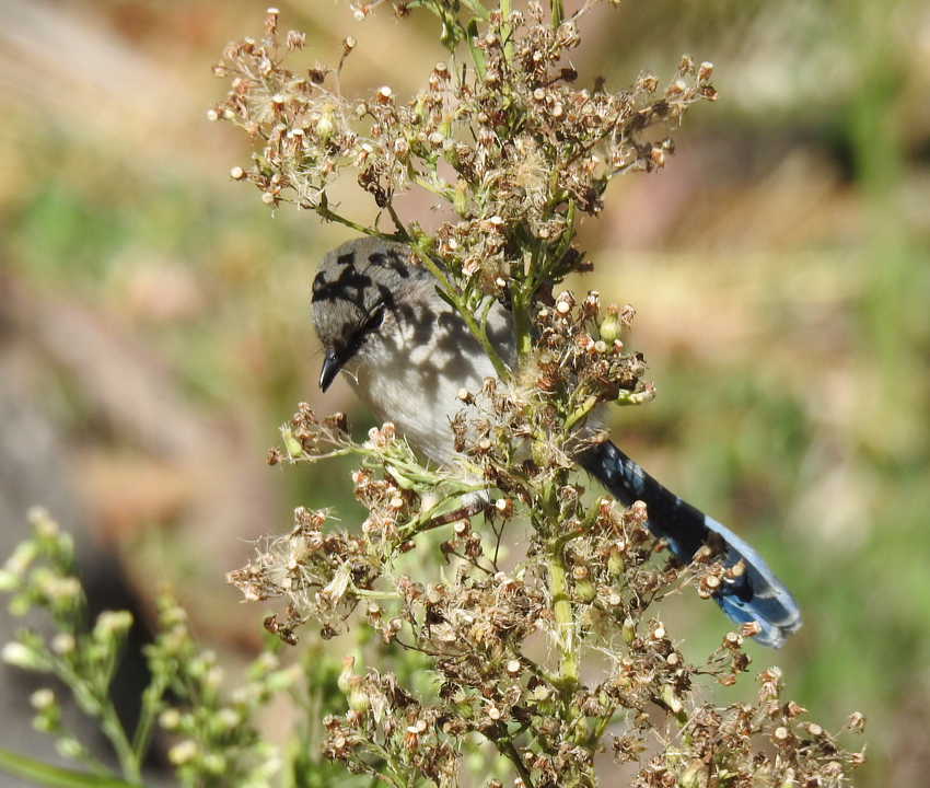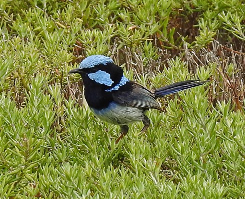 At the end of the long curved concrete wall there is a little patch of broken reeds and other water plants that form a kind of mat on the surface; an ideal place for a variety of aquatic animals. Public access to this area is prohibited so I have to scan the mish-mash of vegetation with my long lens. To my surprise, there are both male and female Blue Wrens feeding on the numerous insects living around the plant material.