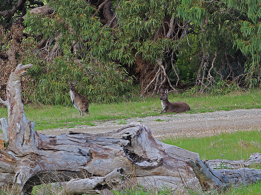 Time is marching on and I have an appointment in Nuriootpa to learn more about the Khaiserstuhl name and its history; which I will reveal in a later post. As I retrace my way to the entrance I hear the distinctive rustle of a larger animal in the scrub to my left. I freeze and ease the camera around slowly. A pair of Western Grey Kangaroos are standing motionless about fifty metres away. An adult and half grown joey. A lovely way to finish my walk.